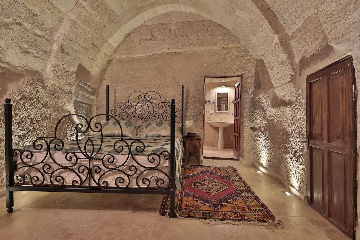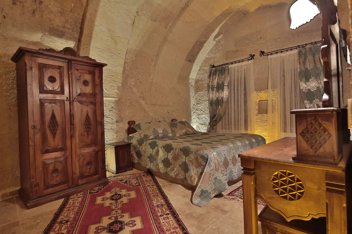 Our Standard rooms are cozy and comfortable, perfect for solo travelers or couples looking for a romantic getaway. Each room is carved into the natural rock formations of the Cappadocia region, providing a unique and authentic experience. Relax in the comfortable queen-sized bed and enjoy the natural temperature control of the cave walls. The room is equipped with modern amenities, including a private bathroom and shower, flat-screen TV, and free Wi-Fi. You'll feel right at home in our Standard rooms, with everything you need for a comfortable and unforgettable stay in Cappadocia.